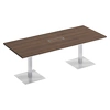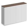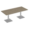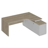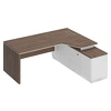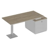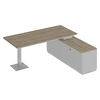 Комбинированные столешницы с нижней частью в цвет корпусов опорных тумб. Заглушка кабель-канала в столешницах столов с двусторонней крышкой: с одной стороны серебристого цвета, противоположная сторона с панелью в цвет столешницы. Вертикальная опора-колонна стола на квадратном утяжеленном основании, шлифованная нержавеющая сталь. Фасады: двери и выдвижные ящики без ручек с системой открывания Push to Open (нажал-открыл). Стеклянные двери в алюминиевой рамке в декоре «нержавеющая сталь» выполнены из матового стекла «белый сатин». Цоколи опорных тумб и шкафов выполнены из металлизированного пластика HPL в декоре «нержавеющая сталь».